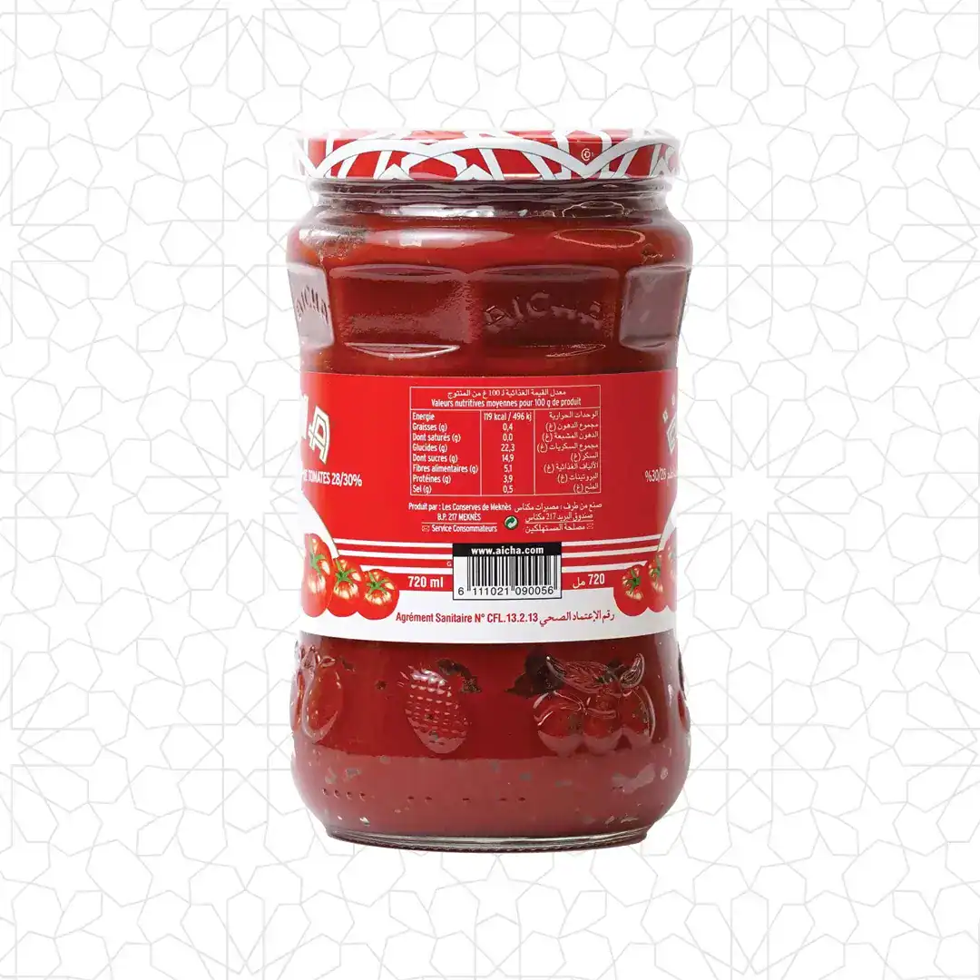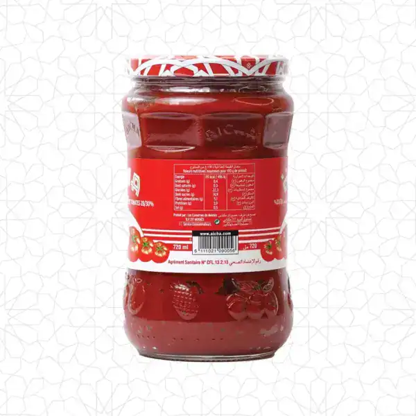 ارتق بتجربتك الطهي باستخدام “Pâte de tomate Aïcha”، معجون الطماطم الراقي الذي تم صنعه بعناية فائقة من أجود أنواع ال اغمر نفسك في النكهة الغنية والأصيلة التي لا تحتوي على أي مواد حافظة أو إضا فات صناعية.يقدم معجون الطماطم Aïcha جوهر الجودة لأطباقك، معززًا كل وجبة بنقاء الطماطم التي نمت تحت أشعة الشمس. ذا التحفة الطهو تمنحك فرصة إبداع أطباق لذيذة وصحية تجسد الطعم الحقيقي للطبيعة.