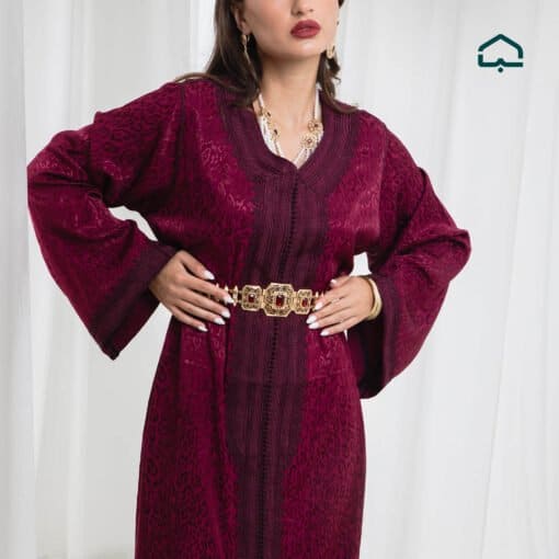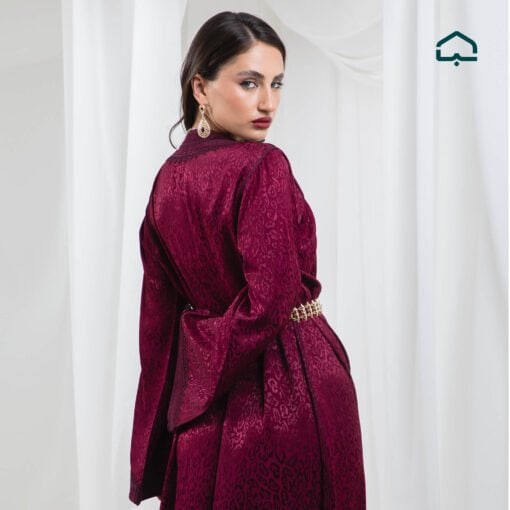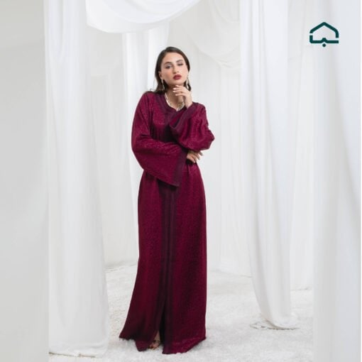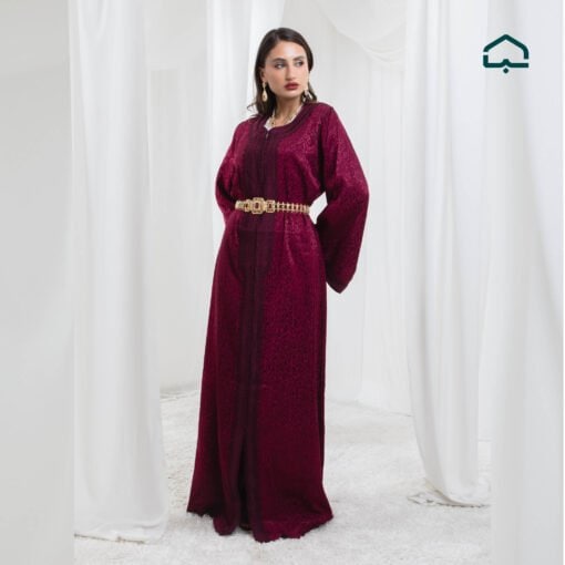 A refined kaftan crafted from luxurious burgundy velvet, a shade known as “blood red” — a timeless symbol of elegance and sophistication.
